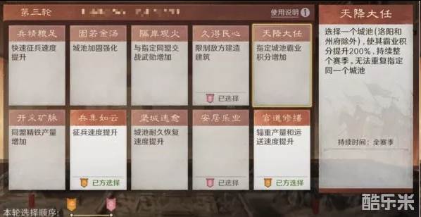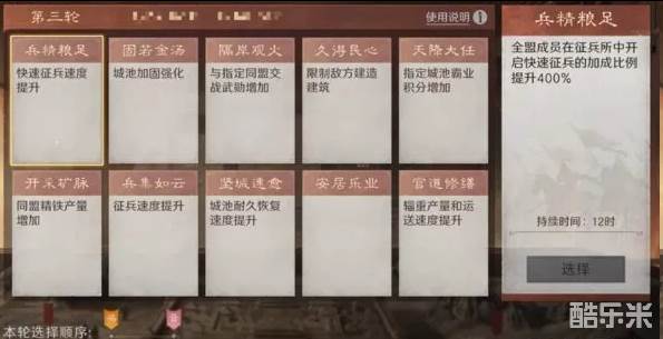 正式进行阶段开启后,系统根据各个国家的霸业积分、成员繁荣度、武勋决定选择顺序,当前处于劣势的国家可以优先选择战略卡。每个国家有10分钟的时间来进行选择,未立国同盟可以选择同盟战略。