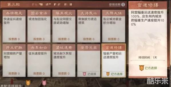 开始选择时同盟成员左上角按钮将以红点形式通知,同盟成员可以参与投票(本国选择阶段将显示战略卡的投票数);拥有指挥权限的官员有决定权,可在结束前更改。不可选择其他国家已经选择的战略卡。