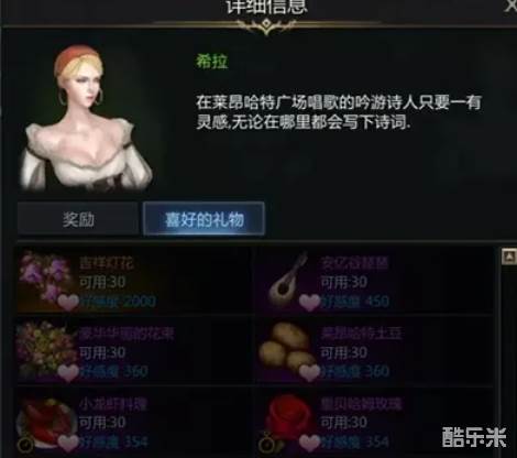 希拉每天可以通过悲伤(社交动作)以及共鸣之歌(乐谱)增加600点的好感度,喜欢的道具为安亿谷琵琶,可以在安亿谷-苍天(主城)-纳达(好感度交换)进行兑换抽取,好感度达到信赖后,预计一共能够获得:7个古代金币(7000银币)+2张希拉的绿色卡片+3个复活羽毛+特别的土豆(重要!阿尔忒弥斯大陆料理第7个刻着圣痕和牙印的土豆前置材料)+领地配方(蓝色道具-祭祀用的锅)