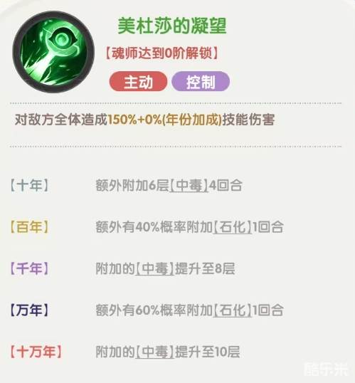 斗罗大陆独孤博的主动技能美杜莎的凝望,对敌方全体造成技能伤害,通过提升魂环年份,达到可额外附加中毒、石化这两种效果。下面和酷乐米小编一起来看看吧