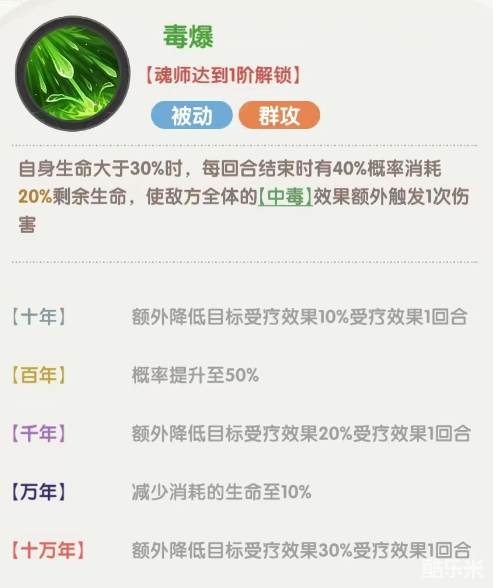 第1个被动毒暴,当独孤博生命值大于30%的时候,在每回合结束有几率消耗自身血量,使对方全体中毒效果额外触发一次伤害,提升魂环年份后,还能额外降低目标的受治疗效果,减少受治疗效果后,对方辅助回复几乎很难再发挥出应有的作用,对于走持续战斗或者是生存流的阵容来说非常克制。