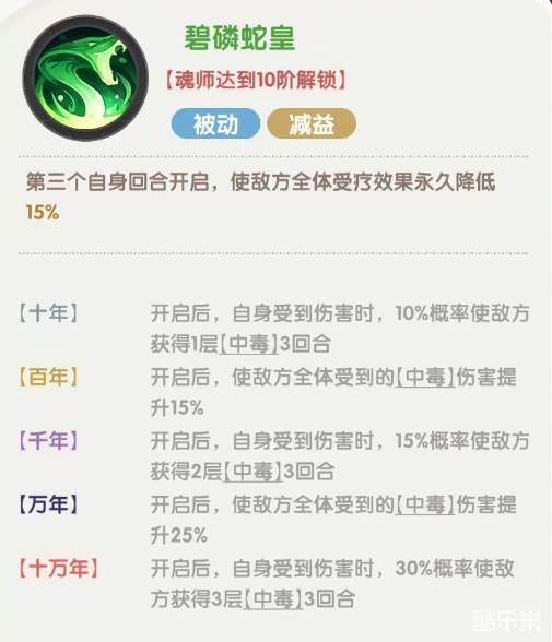 第3个被动碧磷蛇皇,第三回合开启效果,敌方方全体受疗效果永久降低15%。提升魂环年份后,开启武魂真身有几率使对方中毒,只要独孤博自身受到伤害,就有几率使对方中毒,魂环年份越高,叠加中毒层数越高,这些技能综合下来,可很快将对方全体都带上中毒效果。后续只需要随便放一下技能,保证石化几率,就可以发挥出自身的作用了。所以是一个比较好培养的角色,但是缺少爆发且控制不稳定是自身的缺点。