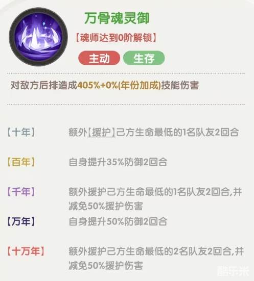 斗罗大陆古榕的主动技能万古魂灵御,这个技能的效果比较出色,可以额外援护己方生命值最低的队友,同时提升自身防御,持续两回合。下面和酷乐米小编一起来看看吧