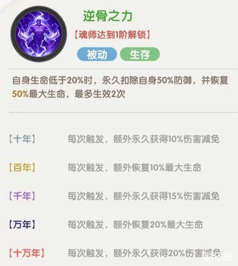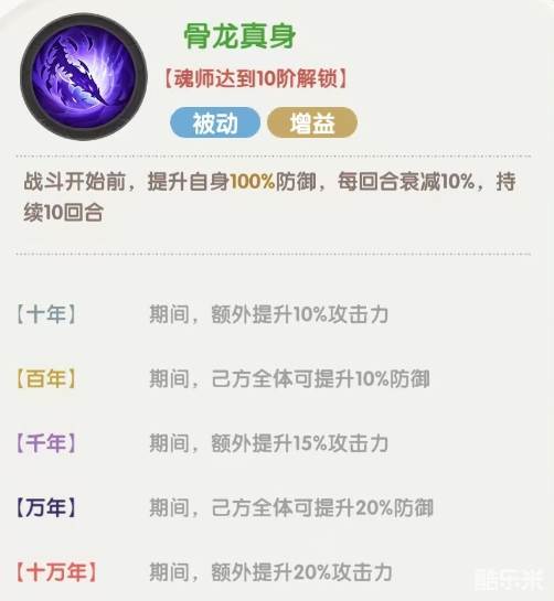 最后一个被动,战斗开始时直接提升100%的防御,最后每回合衰减10%,提升魂环后还有额外的攻击力提升效果。这个被动非常强势,尤其是应对开场爆发流的阵容时,可以更好的在前排承担住伤害,再配合上自身被动,能在场上生存很长时间。