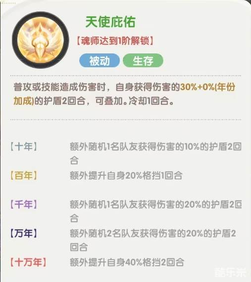 天使真身:开局为自身及两名队友提供护盾,并永久提升全队伤害减免,十万年魂环下减益效果尤为显著。