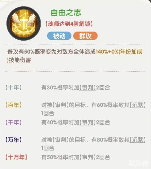 自由之志:普攻概率转化为群体伤害,并附加【审判】与【沉默】效果,限制敌方技能释放;