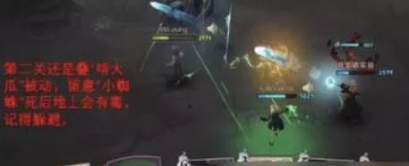 3、关卡二也是叠“啃大瓜”,但要留意“小蜘蛛’先吹走再打死,不然会被小蜘蛛死后毒扣血,蜘蛛毒是无视护盾的;