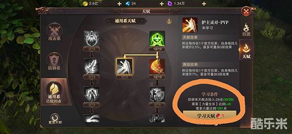 其实天赋没有大家想象的那么复杂,所有职业优先选择防御跟通用,请你注意看天赋的第二排的学习条件。