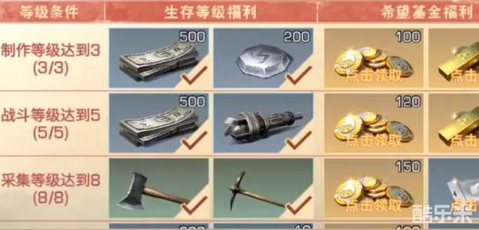 希望基金一共有11个阶段的奖励,在达到每个阶段的要求后,便能领取该阶段的东西。第一个阶段只需要制作等级达到三级后,便能领取了。制作等级可以通过制作半产品来提高,一般做木板消耗的资源最少,在熟练度达到一定后就能升为三级,之后就能获得信用点和金条角落。第二阶段和第一阶段一样,都是信用点和金条奖励,不过这个需要战斗等级达到五级后才能领取。战斗等级只需要使用武器来击杀感染者,或者世界boss就能获取到熟练度来升级。