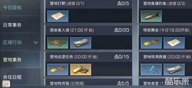 除了营地内的固定任务,快乐101那边也有很多限时活动等着你。特别是周末的时候会有巡逻任务,顺路做一下能拿到额外奖励。秋日森林的悬赏任务板在安全屋右边,直接全接就拍照任务和资源点任务都特别简单