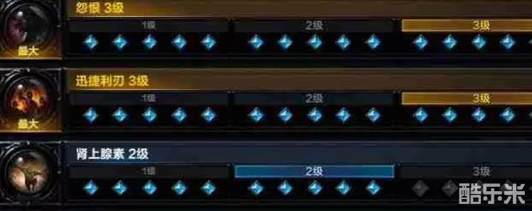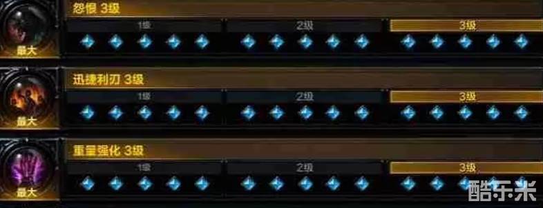奥义精通1级》怨恨3级》迅捷利刃3级》重量增加3级》肾上腺素2级》觉醒1级或2级