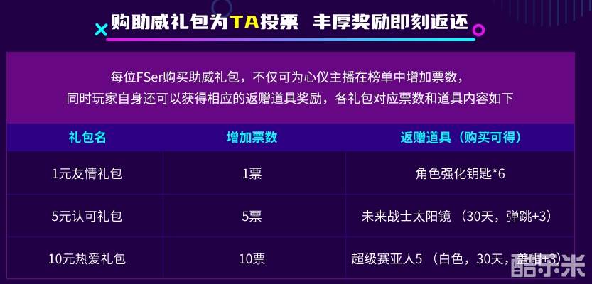 为鼓励粉丝积极支持心仪主播,活动推出了极具吸引力的助威礼包机制。据活动规则介绍,每位 FSer(粉丝)购买助威礼包后,不仅能为喜爱的主播在榜单中增加相应票数,助力主播冲击更高排名,自身还可获得对应的返赠道具奖励。不同助威礼包对应不同的增加票数和返赠道具内容,粉丝可根据自身需求和支持力度灵活选择。更值得关注的是,活动还设置了票数兑换代金券的福利环节,粉丝积累的票数可兑换实用代金券,进一步提升了参与活动的性价比,实现了“支持主播“与“自身获益”的双赢。