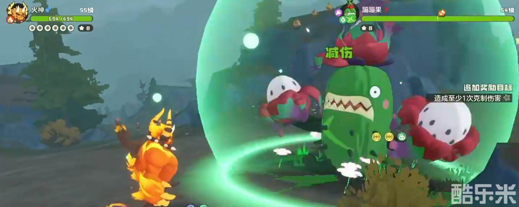 成功击破护盾后,系统将提供三项增益选择。若队伍缺乏物攻加成,推荐优先选取生命值提升效果,以增强第二阶段的生存能力。随后进入精灵对战模式,面对草属性为主的蹦蹦果,火系精灵“火神”是最佳应对人选,凭借属性克制可大幅提高输出效率。