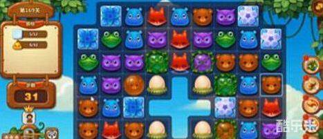这一关看似比较简单其实是非常难的,冰块被分配在各个角落小鸡被重重保护,竖直特效在本关作用是有帮助的他能帮助你去冰和解决鸡蛋周围的障碍,没有发黄光的小动物就消底部这个原则常用,黄小鸡是咱们的目标元素所以快速的破蛋。