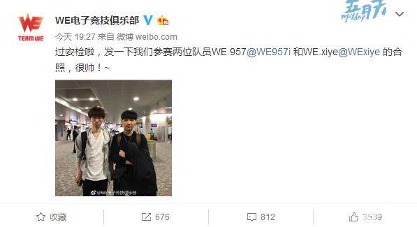 WE电子竞技俱乐部:过安检啦,发一下我们参赛两位队员WE.957@WE957i和WE.xiye@WExiye的合照,很帅!~