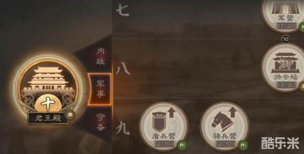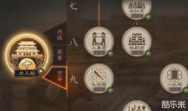 三国志战略版侠客军守备类建筑中,九宫八卦阵和城墙是保命核心。九宫格提升友军15%伤害,八卦阵减少15%所受伤害,配合高等级城墙能有效拖延敌人进攻节奏。城防军和校尉府也要适当投入,前者防止低兵器械偷家,后者增强城防守军强度。咱们的耐久度比正规军少,这些防御加成就是续命关键。下面和酷乐米小编一起来看看吧