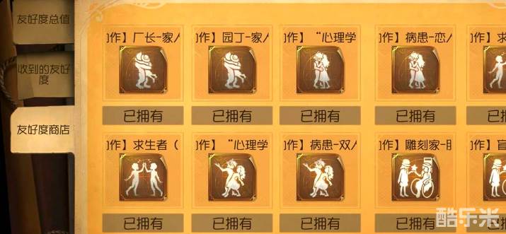 第五人格友情点当前可换取的互动动作里只有give me five是求生者的通用动作,它也有男女两种,只有把两个性别都换了才能让所有求生者角色都能使用这个动作。然后是特定角色之间的专属动作,比如厂长和园丁之间的拥抱动作,心理学家和病患之间的拥抱和双人舞动作,还有雕刻家和盲女之间的祈愿动作。下面和酷乐米小编一起来看看吧