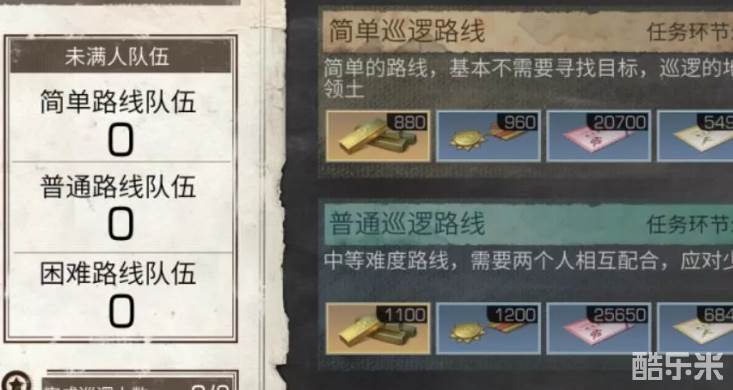建议玩家选择数量比较充足的基础物资提交,例如木头、麻草、布料等等。不要为了多点贡献值,就提交比较稀有的二阶物资,这完全就是亏损行为。前往营地的公告牌附近,点击保安官英格雷就能够选择巡逻任务。通常有三条路线,一条是比较简单的,只要有玩家一个人就能完成。不需要我们寻找到任何目标,巡逻的路线也是其他人开辟过的。普通难度的需要两个人相互配合,过程中会遇到一些中等难度的怪物。困难巡逻路线需要最少完成四个环节的任务,最少也要四个玩家组成小队接取,会遇到许多高等难度的怪物。