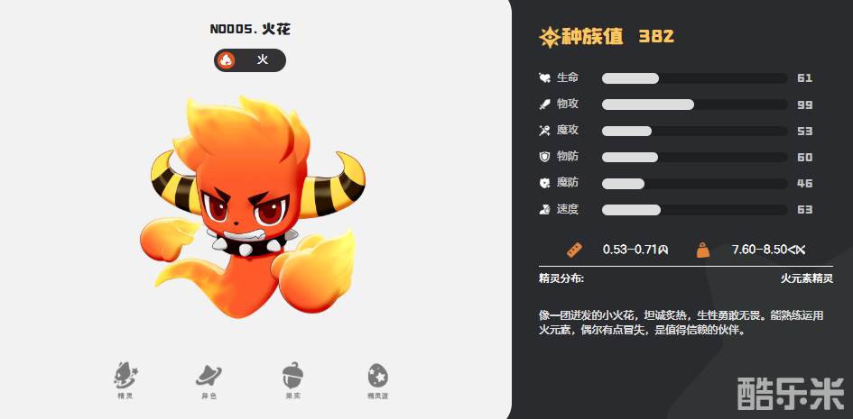 洛克王国大家可以在火花,喵喵,水蓝蓝3个精灵当中进行选择,这都是游戏系统会自动赠送给大家的,如果大家选择火花的话,最后在阵容流派上面建议大家走火系流派,因为火花也是火属性当中比较出色的一个精灵,它目前更适合的是高爆发的能力,在定位上面火花也是速攻型的角色,所以在阵容组成的情况下面,火花一般是放在主要核心位置上面的,它在技能效果上面有一个特性是带有一定的助燃机制,也就是说它释放火属性的技能的时候,它每一层可以增加助燃的状态,这里助燃的状态每一层成功施加的情况下,就能提升它15%的伤害数值。下面和酷乐米小编一起来看看吧