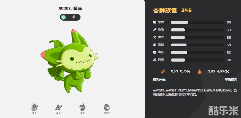 第二个喵喵的话,它是草属性当中的一个精灵,这个精灵主要用处是放在生存上面,大家使用喵喵的话,它的效果基本是定位在半肉型上面,因为本身的血量数值是非常高的,所以拥有一定的持续作战特性,在定位效果上面,它有一个优势就是带有一定的循环效果,喵喵在释放自己技能的时候还可以给自己带来生命值恢复能力,但是这里恢复的话,会根据它的最大生命值的数值来进行提取,提取到15%的数值才给他进行恢复,所以这里喵喵原本的生命数值越高的情况下,达成的恢复就会数值越高。