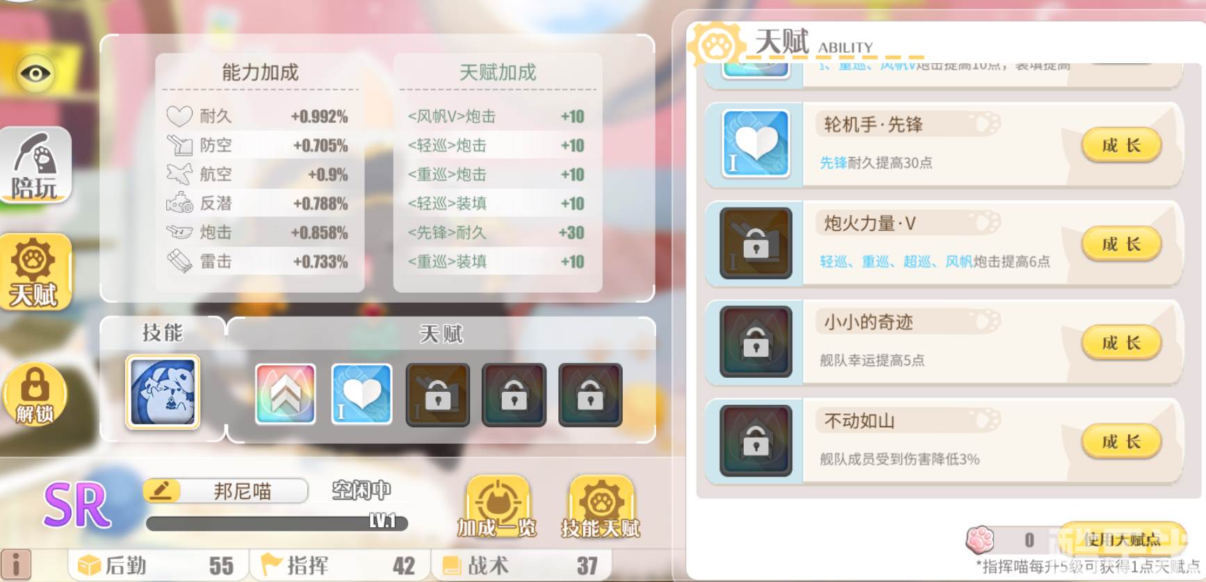 从属性配置来看,邦尼喵在后勤类数值上有不错的表现,尤其体现在耐久、炮击与航空方面的增益效果。其拥有的固定天赋包括:不动(全队减伤3%)、战旗重扬(提升轻巡、重巡及风帆舰种的炮击与装填各10点)、小小的奇迹(舰队幸运值+5)、炮火覆盖V(增强轻巡、重巡、超巡及风帆舰种的炮击能力),以及轮机长·先锋(先锋编队耐久增加60点)。