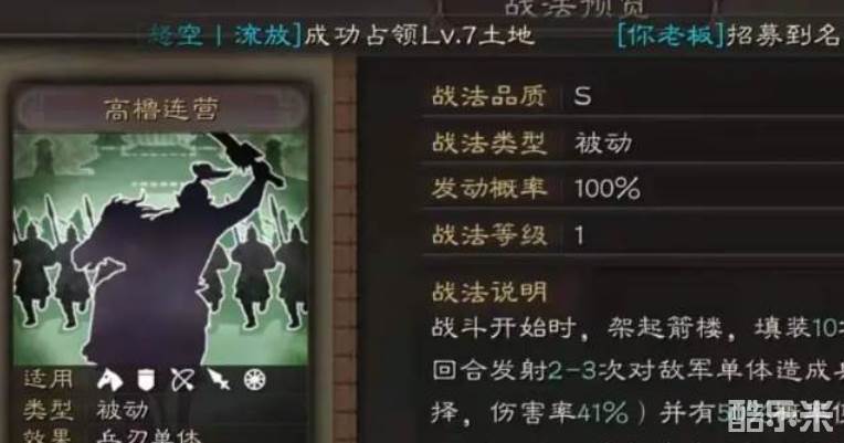 战法太平道法与士别三日是张角的核心配置,前者提高主动战法发动率与暴击,后者增强生存与稳定输出。辅助战法推荐沉沙决水、妖术等可施加水攻或沙暴的技能,以联动五雷轰顶的震慑效果。