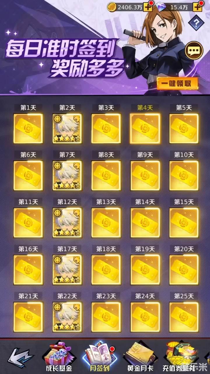 初始赠送UR角色五条悟·涩谷为核心培养对象,搭配每日签到资源持续强化3。