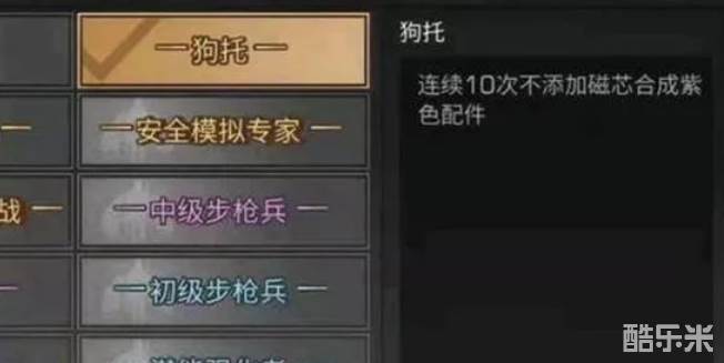 1:狗托这个称号需要玩家连续十次不添加磁芯合成紫色配件,就可以获得了;