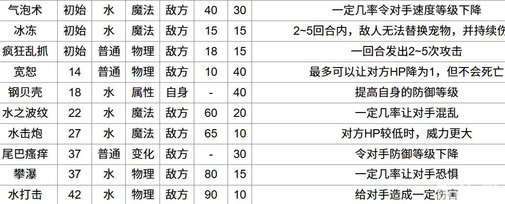 宽恕这个技能虽然是普通的物理攻击技能,这个技能最有一个关键的用处就能能够把对方的hp下降到1点,尾巴瘙痒则是能够使对方的防御等级下降,攀瀑会有一定的几率让玩家陷入到恐惧之中,水打击则能够给敌人造成90点的伤害,这一套技能主打的就是先降低敌方的防御和hp,让敌人陷入到恐惧在进行收割。