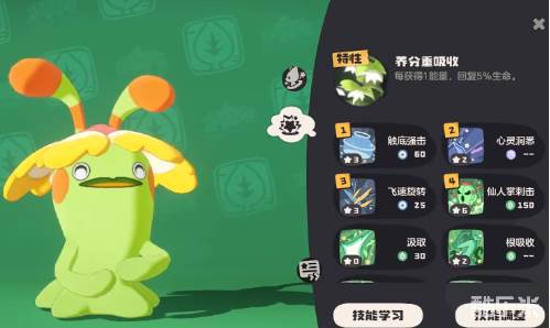 从属性方面来看,作为草系精灵,就可以有效克制土系还有水系。在对战这类型的宠物时,就会拥有明显的优势,但比较害怕火系技能,还有飞行系技能。基础性的面板比较亮眼,物理性攻击还有生命值数值都不低,不过短板也比较明确。相对来说速度比较慢,而且物理性防御会比较弱,不过初期属性不足的话,也无需慌。随着等级的提升,各项基础属性全部都会稳步的增强。核心的特性就是注重于吸收,这才是续航的关键。每获得一点能量就可以有效回复自身5%的生命值。