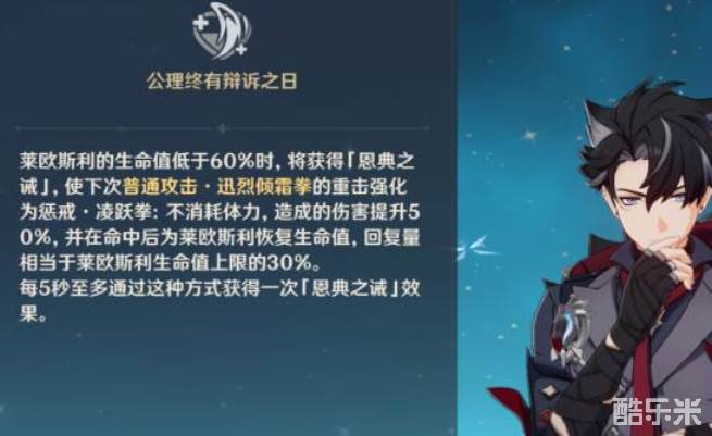 莱欧斯利的元素爆发没什么特别的,会朝敌人造成连续几段冰伤,同时最后一段会有荒性伤害。另外重要的还有莱欧斯利的天赋,在莱欧斯利的固有天赋中,会发现当莱欧斯利的生命值在不足60%时,重击不消耗体力,并且增伤回血。