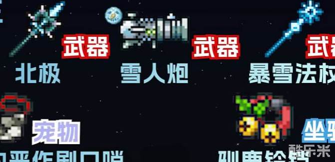 泰拉瑞亚霜月五神装包括雪人炮、北极、暴雪法杖、圣诞树剑和剃刀松。这些装备在霜月事件中通过击败冰雪女王概率获得,而霜月事件本身需要使用调皮礼物召唤。调皮礼物的合成材料为20个丝绸、5个灵气和5个恐惧之魂,在秘银砧或山铜砧处制作。下面和酷乐米小编一起来看看吧