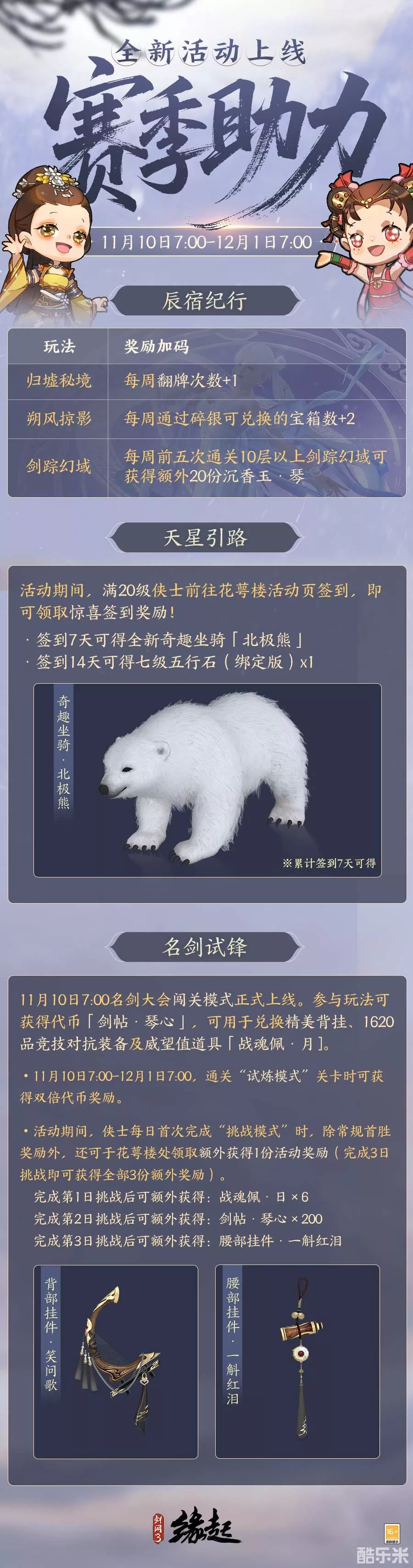多重活动同步开启,参与各玩法可获得额外奖励,助力侠士加速成长!签到活动今日上线,满20级侠士签到可领取各类数值奖励,更有奇趣坐骑「北极熊」、七级五行石(绑定版)赠送惊喜!
