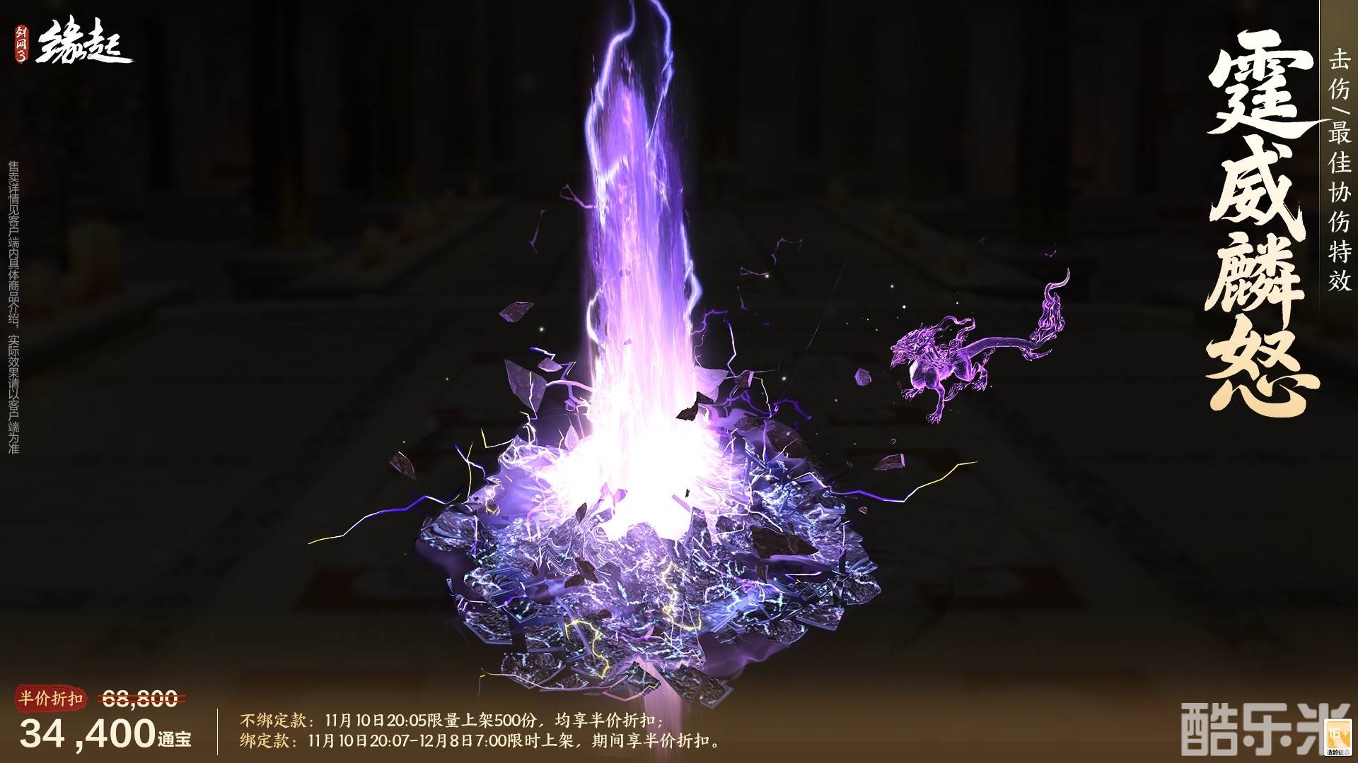 特效触发后,有麒麟一现,色如紫霞,鳞甲闪烁,鬃鬣飞扬,身姿矫健若腾龙。右足踏地,地面崩然骤裂。地面轰然洞穿,涌出紫光,光柱直冲霄汉。电蛇蜿蜒其间,灼灼耀眼,光彩照人。