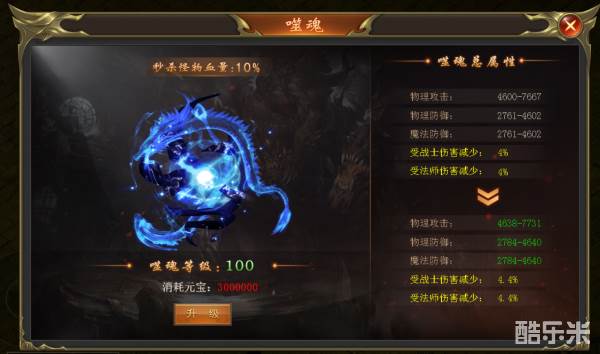 消耗元宝提升噬魂系统等级可以获得攻击,防御,生命和秒杀怪物血量属性,打怪几率触发秒杀怪物血量,秒杀当前怪物最大生命值的百分比血量,噬魂等级越高秒杀的血量越多。