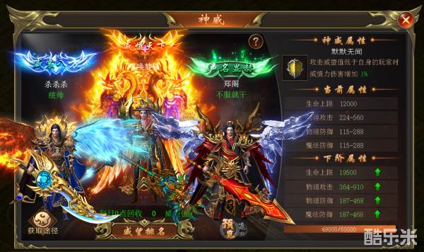 神威系统通过活动或日常任务获得神威值提升除了能增加生命值,物理攻击和防御以外,在PVP中对神威低的玩家压制,造成额外的威慑伤害,提升威名还可以获得排行榜称号。