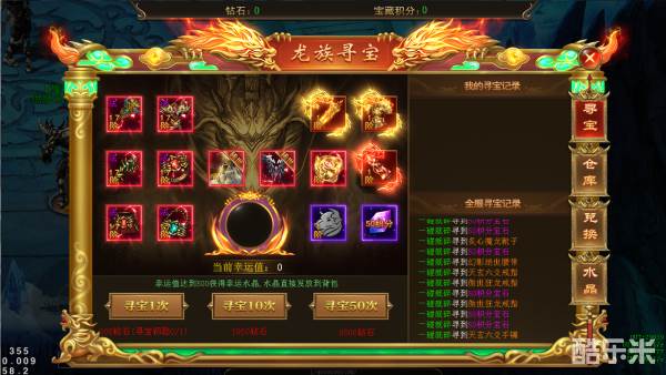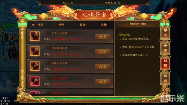 (3)积分兑换:每寻宝一次获得1宝藏积分,宝藏积分可以在这个页签中兑换武器,衣服,首饰和道具。兑换的装备保留精炼的等级,武器保留幸运值,龙装,神装和圣装不可以兑换。
