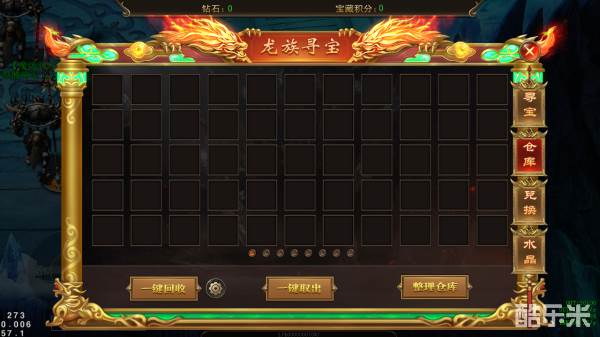 (2)宝藏仓库:所有的寻宝和夺宝获得的装备和道具都会保存在仓库里,可以一键回收低等级的装备,高等级的装备或道具可以一键提取到背包。