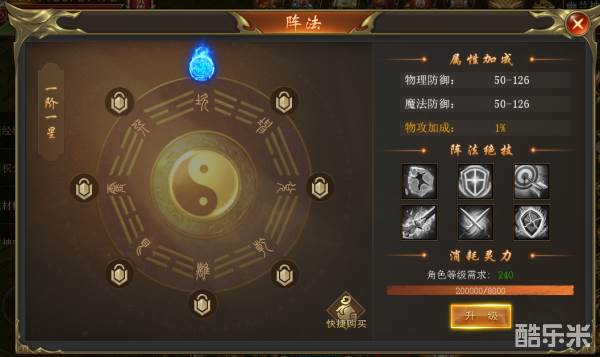 阵法系统分为8阶,每阶10星,提升阵法属性可以获得攻击加成属性提升,阵法等级越高获得的攻击加成就越高,同时也会获得特殊技能。