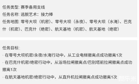 《三角洲行动》S7赛季的“逃脱艺术:接力棒”任务中,玩家需分别在零号大坝、巴克什及航天基地的指定拉闸撤离点各成功撤离一次。下面和酷乐米小编一起来看看吧
