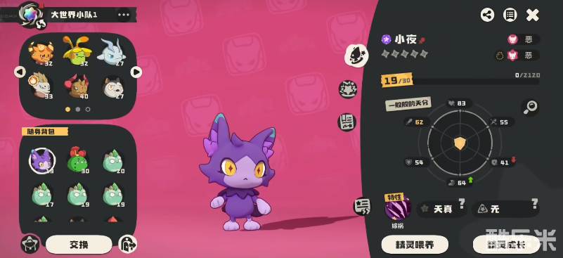 洛克王国小夜初始形态名为小夜,外形是一只紫色毛发、长有恶魔尾巴的小猫,总种族值为322。虽然基础数值不算顶尖,但其自带被动技能“嫁祸”,可免疫首次受到的伤害,极大提升生存能力。它还能模拟小洛克的外形进行隐藏,迷惑对手,是游戏中少见的具备拟态机制的精灵,需进入限定秘境才能捕捉。下面和酷乐米小编一起来看看吧