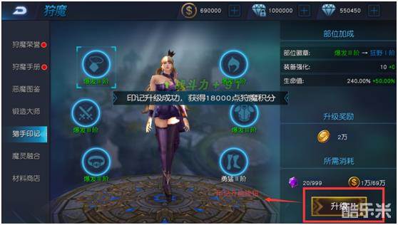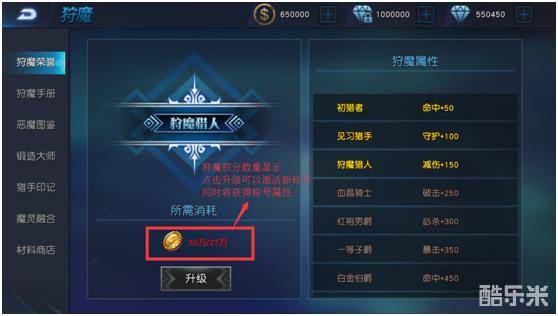 消耗狩魔积分,可对狩魔称号进行升级,升级后可解锁更高级的称号并获得更多的稀有属性加成。