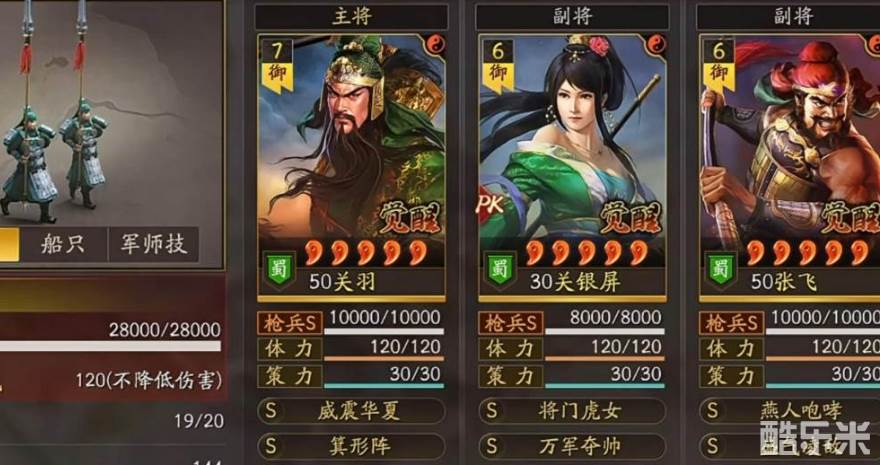 网红枪的弱点是五十满科技之后,dps会有所疲软。第三种队伍是群弓,它在定军山中常常作为碰瓷队来用。里面的角色对红度要求不高,因为它完全靠控制来碰瓷。就算手中没有SP朱俊,用紫色也能打出出色的成就。定军山有好用旗阵的情况下,碰瓷会变得更加丝滑。第四种队伍是关关张,其中关羽的标配是威震、威谋以及箕形阵。关银屏需要带上盛气、青州兵以及将门虎女等等, 至于张飞可以带上燕人、横扫以及据水。关关张的战法搭配不是固定的,仅需有盛气、横扫以及箕形阵就行。