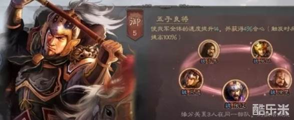 乐进的自带战法输出特别高,但使用后会有虚弱无法续战的负面效果,所以在另外2个战法的选择上就倾向于带一些辅助功能性的战法,从而让乐进在队伍中作为一个伤害和辅助兼顾的角色。