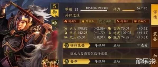 乐进是5御的武将,在骑兵、盾兵、枪兵以及器械这几个方面的数值表现优秀,战法搭配也是很给力,不仅有造成极高兵刃伤害的临战先登,还能获得洞察和倒戈效果,搭配奋突后普攻伤害提高而且还能缴械。