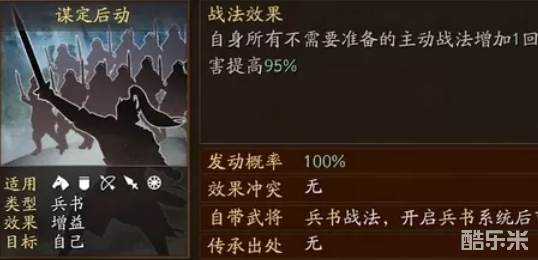 兵书的选择也是围绕这个点来选择的,比如推荐使用“虚实”、“谋定后动”以及“鬼谋”。特别是谋定侯东,这个战法的效果可以让自身所有无需准备的主动战法持续时间多1个回合,同时提高该战法的伤害。