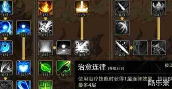 1、学习曲玉的三个技能:治疗连律、大治疗术和群体治疗,仅需将“治疗连律”升至满级即可。该技能满级后可减少45%的技能冷却时间,是维持循环的关键。