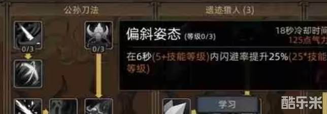 3、学习公孙巴兰的“偏斜姿势”技能,冷却时间为16秒,持续9秒,满级时提供高达75%的闪避加成。