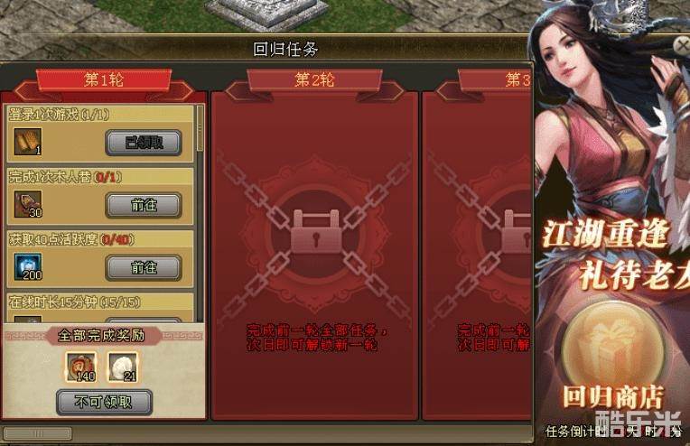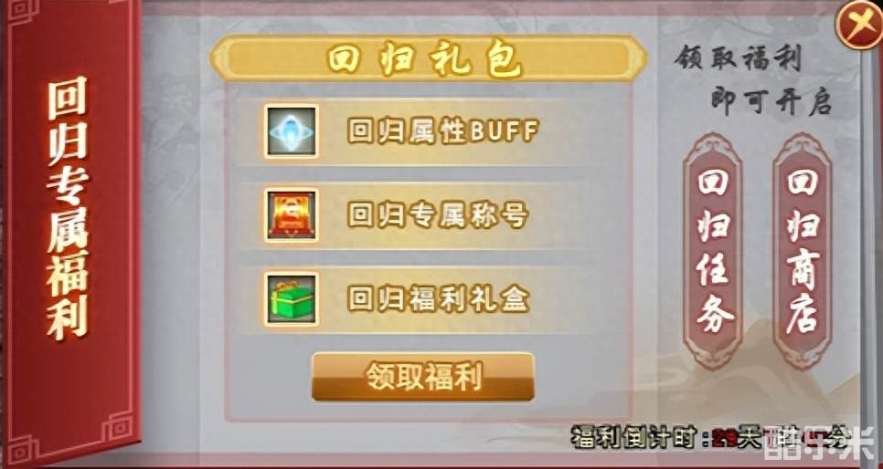 3、紧跟回归任务指引,完成每天的回归任务领取回归玉符,可在回归商店兑换大量提升战力的道具,大侠可高效积累资源,少走弯路。