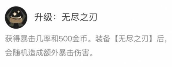 升级无尽之刃:获得暴击几率和500金币。装备【无尽之刃】后,你的暴击会随机造成额外暴击伤害。